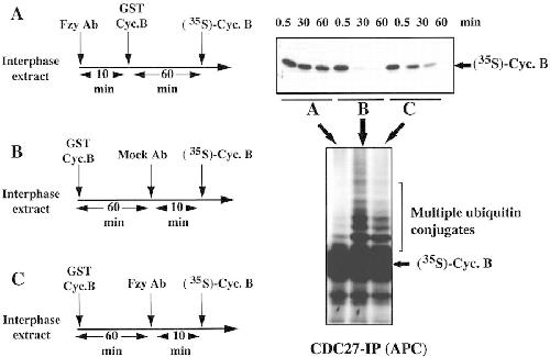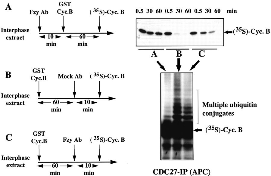 Differential effects of FZY antibodies added to interphase egg extracts before or after activation of the APC/cyclosome by GST–cyclin B–cdc2 kinase. (A) Four μg of affinity-purified FZY antibodies (FZY Ab) were added to 40 μl of interphase egg extract. After 10 min, recombinant GST–cyclin B (1 μg) was added, and a further 60 min later 35S-radiolabelled cyclin B1, translated in reticulocyte lysate (2 μl), was added (the same result was obtained if GST–cyclin B and FZY antibodies were added simultaneously). (B and C) GST–cyclin B was added to 40 μl of the same interphase egg extract. After 60 min, 4 μg of control immunoglobulins (Mock Ab) and affinity-purified FZY antibodies were added (B and C respectively). In all cases, samples (3 μl) were taken at 0.5, 30 and 60 min after addition of 35S-labelled cyclin B1 and analysed by SDS–PAGE and autoradiography for degradation of [35S]cyclin B1 (upper panel), and an additional sample (15 μl) was taken at 15 min and used for ubiquitinylation assay (lower panel) as described in Materials and methods.