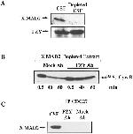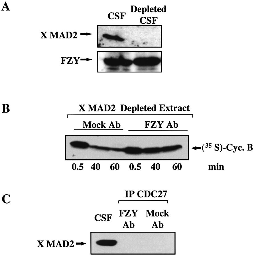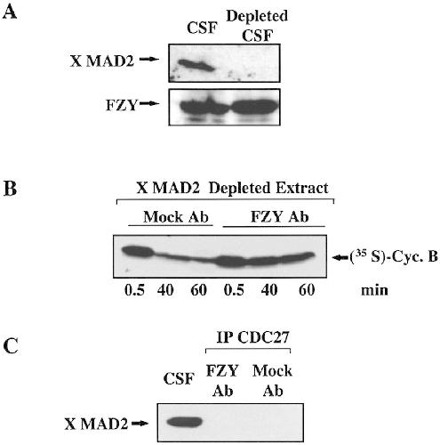 X-MAD2 is not required for the block of cyclin degradation induced by FZY antibodies. (A) A CSF extract (100 μl) was depleted with affinity-purified X-MAD2 antibodies (10 μg) immobilized on protein A–Sepharose beads. One μl of supernatant (Depleted CSF) or of the starting extract (CSF) was analysed by Western blotting and probed with affinity-purified X-MAD2 (upper panel) or FZY (lower panel) antibodies. (B) The X-MAD2-depleted extract (20 μl) was treated with 2 μg of affinity-purified FZY antibodies (FZY Ab) or control immunoglobulins (Mock Ab) and received 1 μl of in vitro translated 35S-labelled cyclin B1. After 10 min, 1 μM microcystin was added. Samples (3 μl) were taken at the indicated times and analysed by SDS–PAGE and autoradiography for degradation of cyclin B1. (C) Twenty μl of CSF extract were treated with 2 μg of affinity-purified FZY antibodies (FZY Ab) or control immunoglobulins (Mock Ab). After 10 min, antibodies or immunoglobulins were removed with protein A–Sepharose beads, and supernatants immunoprecipitated with affinity-purified CDC27 antibodies cross-linked to protein A–Sepharose beads (IP CDC27). Material eluted from each matrix, as well as 2 μl of starting material, were analysed by Western blotting and probed with affinity-purified X-MAD2 antibodies.