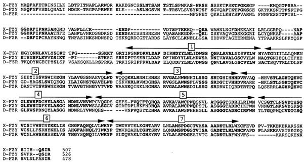 Comparision of the amino acid sequences derived from cDNAs of Xenopus Fizzy (X-FZY), Drosophila Fizzy (D-FZY) and Drosophila Fizzy-related (D-FZR). Regions with identity between the X-FZY and at least one of the two other sequences are in bold. The seven WD-40 repeats in the C-terminal region are indicated by numbered arrows. The comparison was generated with the MAP program (Xiaoqiu, 1994).