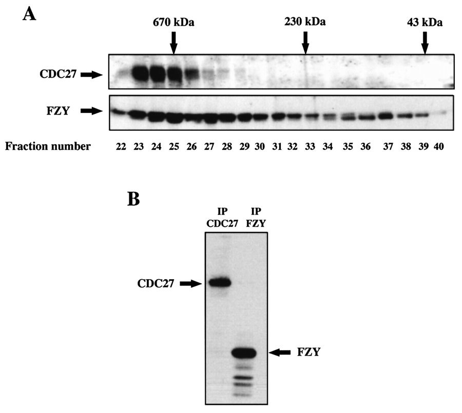 X-FZY is a component of a high molecular weight complex distinct from the APC/cyclosome. (A) Side-by-side analysis by Western blot of consecutive fractions (30 μl loaded), after chromatography of a CSF extract by gel filtration on a Superdex 200 column in the presence of 1% Triton X-100 and 0.5% Na deoxycholate. Upper panel: blot probed with affinity-purified antibodies directed against CDC27. Lower panel: blot probed with affinity-purified antibodies directed against FZY. The vertical arrows indicate the positions of elution for thyroglobulin (670 kDa), catalase (230 kDa) and ovalbumin (43 kDa). (B) Fractions corresponding to the peak of high molecular weight FZY complex were pooled and 400 μl immunoprecipitated without dilution with affinity-purified CDC27 (IP CD27) or FZY (IP FZY) antibodies cross-linked to protein A–Sepharose. Materials eluted from each matrix were analysed by Western blotting with a mixture of affinity-purified CDC27 and FZY antibodies.