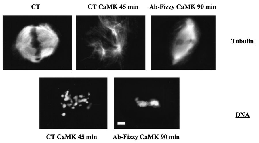 FZY antibodies prevent in vitro assembled spindles from exit of metaphase arrest in response to CaMKII. A suspension (20 μl) of in vitro assembled spindles, arrested at metaphase by CSF, was treated for 15 min with affinity-purified FZY antibodies (Ab Fizzy) or the same amount (2 μg) of rabbit immunoglobulins (CT: control). Constitutively active, in vitro translated CaMKII (CaMK) was added (2 μl). Samples were taken before, or 45 and 90 min after CaMKII addition, and examined by fluorescence microscopy. Chromosomes were visualized by the fluorescence of the DNA-binding dye Hoechst 33342, and microtubules with rhodamine-labelled tubulin. The bar in the lower right micrograph corresponds to 2.5 μm (same magnification for all micrographs).