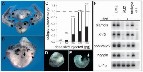 induces organizer markers (F). Embryos were injected ventrally with 1 ng xfz8 RNA at the 8-cell stage. At stage 10.25, dorsal marginal zones