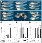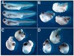 enlarged heads, enlarged cement glands and shortened body axis (E versus F).