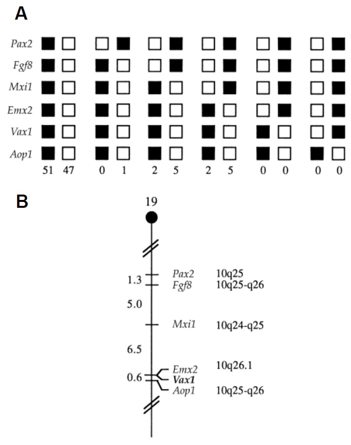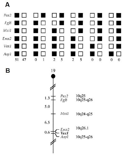 (A) Vax1 was placed on mouse chromosome 19 by interspecific
