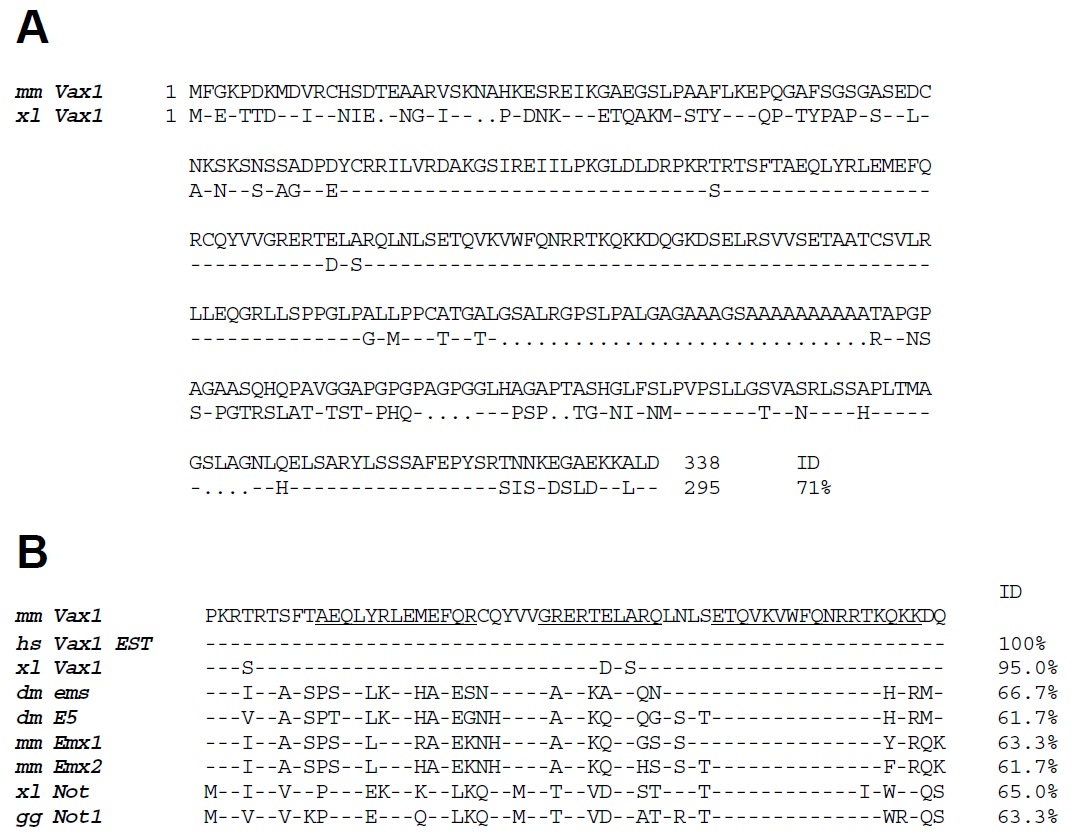 Fig. 1. (A) Vax1 mouse and Xenopus amino acid sequence comparison. GenBank accession