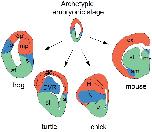 Expression of the Emx-1 and Dlx-1 homeobox genes define three molecularly distinct domains in the telencephalon of mouse, chick, turtle and frog embryos: implications for the evolution of telencephalic subdivisions in amniotes.