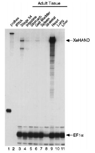 Fig. 6. Expression of XeHAND in adult frog tissues. The distribution of XeHAND mRNA in adult frog tissues was analysed by RNase protection assay. Lane 1, undigested probes; lane 2, tRNA control; lanes 3â11, tad- pole embryo (stage 34), intestine, stomach, gall bladder, spleen, skeletal, heart, lung, liver RNA, respectively. Five micrograms of total RNA was used in each assay. Full-length protected fragments for each probe are indicated. As an internal control, a probe for the highly abundant EF1-a was included in the XeHAND assay.