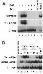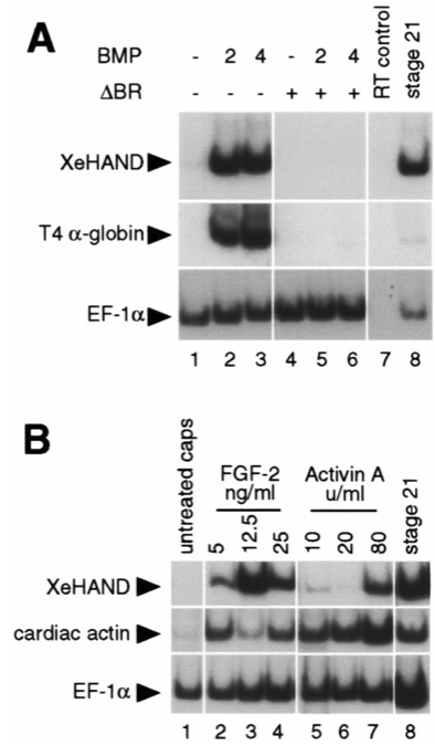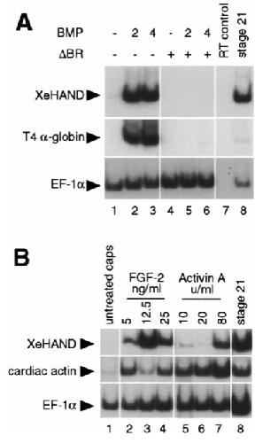 Fig. 7. Induction of XeHAND expression in animal cap explants. Animal cap explants were assayed for the presence of XeHAND, EF1-a, cardiac actin and T4 a-globin by RT-PCR. (A) RNA encoding BMP-2 (lane 2) and BMP-4 (lane 3) both induce high levels of XeHAND and T4 a-globin (a marker for ventral mesoderm differentiation). Both responses are blocked by the truncated BMP receptor (lanes 5 and 6). (B) All doses of soluble FGF-2 strongly induce XeHAND expression (lanes 2–4), but soluble acti- vin A induces little or no XeHAND expression except at exceptionally high doses (lanes 5–7).