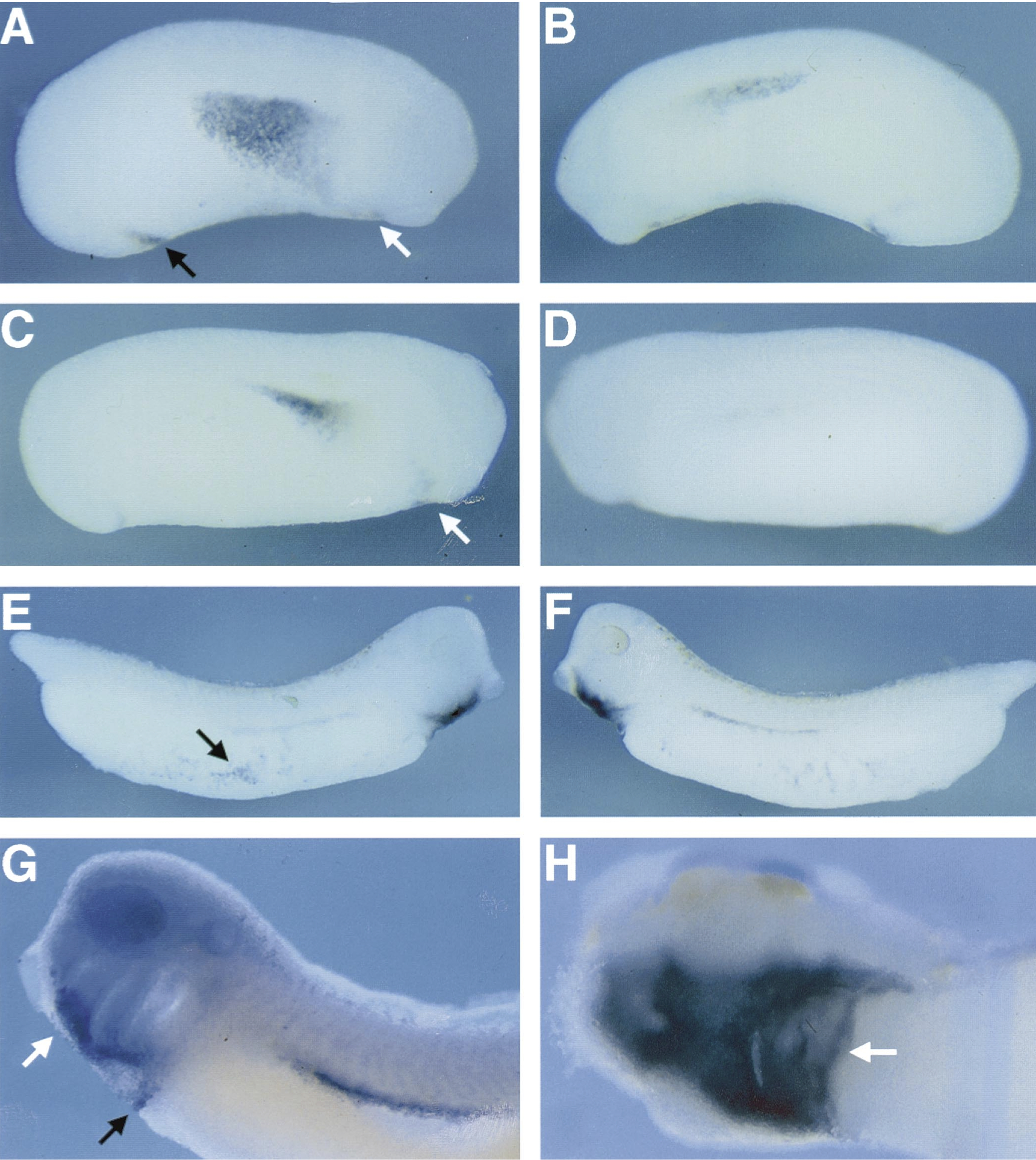 Fig. 3. Whole-mount in situ analysis of XeHAND expression. (A) Lateral view of a Xenopus tailbud embryo (stage 24). Anterior is to the right. Staining in the presumptive heart region is indicated by a white arrow, and staining in the proctodeum is indicated by a black arrow. (B) View of the same embryo from the opposite side. (C) Lateral view of an embryo at stage 27. Anterior is to the right. Staining in the presumptive heart region is indicated by a white arrow. (D) View of the same embryo from the opposite side. (E) Lateral view of a stage 32 embryo. Staining in the vitelline veins is indicated by a black arrow. (F) View of the other side of the same embryo. (G) Lateral view of a stage 33/34 embryo. Anterior is to the left. Staining in the ventral aorta and aortic arches is indicated by a white arrow, and staining in the sinus venosus (venous inflow tract) is indicated by a black arrow. Expression in the presumptive posterior cardinal veins running ventral to the somites can clearly be seen. (H) Ventral view of a stage 33/34 embryo. Overstaining reveals XeHAND expression in the heart tube (white arrow).