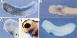Fig. 5. Double-labelled in situ hybridisation analysis of XeHAND expression. (A) Late tailbudembryo (stage 31), lateral view showing staining for MLC113 (blue) and XeHAND (reddish-brown). Note the distinct gap between the bottom of the somites, and the domain of XeHAND expression (white arrow). (B) Tailbud (stage 28) embryo, ventral view showing staining for XMLC2a (light blue) and XeHAND (purple). Note the thin line of XeHAND expression dividing the two patches of XMLC2a (black arrow). (C) Lateral view of a swimming tadpole (stage 31) showing staining for XMLC2a (light blue; black arrow) and XeHAND (reddish-brown). The arrowhead indicates that portion of the ventral surface that is not covered by mesoderm. (D) Feeding tadpole (stage 40) lateral view showing staining for XMLC2a (light blue) and XeHAND (purple). XMLC2a staining in the heart is indicated by a black arrow, and XeHAND staining in the ventral aorta and first aortic arches are indicated by the white arrow. The embryo was cleared with BB/BA. (E) Lateral view of a tailbudembryo (stage 27) stained for T4 a-globin (purple) and XeHAND (light blue).