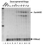 Fig. 2. Expression of XeHAND in Xenopus embryos. The distribution of XeHAND transcripts was analysed by RNase protection assay. Lane 1, undigested probes; lane 2, tRNA control; lanes 3â12, unfertilised oocyte, stages 8, 10, 12.5, 14, 17, 20, 23, 34, 42 embryo RNA, respectively. Two embryo equivalents of RNA (10 mg) was used in each case. Full-length protected fragments for each probe are indicated. As an internal control, a probe for XMax2 (which is expressed at constant levels throughout early development (Tonissen and Krieg, 1994)) was included in the XeHAND assay.