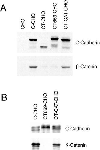 Figure 2. Expression of C-cadherin and mutant cadherin proteins in CHO cells. (A) Comparison between cadherin expression and cellular β-catenin levels. Western blots of lysates from parental CHO cells and CHO cells stably expressing wild-type C-cadherin (C-CHO, clone 12), tailless cadherin mutant (CT-CHO, clone 8), a deletion mutant lacking the catenin-binding region (CT669-CHO, clone A1) and a deletion mutant lacking the juxtamembrane region of the cytoplasmic tail (CT-CAT-CHO, clone 13) were probed for the C-cadherin ectodomain (top), then stripped and reprobed for β-catenin (bottom). Identical amounts of total cellular protein were loaded in each lane. Both the CT669 and CT-CAT mutants display polypeptide bands that run at or slightly higher than wild-type C-cadherin, consistent with the addition of multi-copy myc-epitope tags. Total cellular β-catenin levels were increased in cells expressing wild-type C-cadherin and CT-CAT, but not in cells expressing the CT or CT669 mutants. (B) β-catenin coimmunoprecipitates with wild-type C-cadherin and CT-CAT, but not with CT669. Lysates from C-CHO, CT669-CHO, and CT-CAT-CHO cells were immunoprecipitated with a pAb directed against the C-cadherin ectodomain, transferred to nitrocellulose and probed for C-cadherin (top) or β-catenin (bottom). C-cadherin immunoblots identify mature and precursor forms of the wild-type and mutant cadherins.
