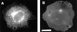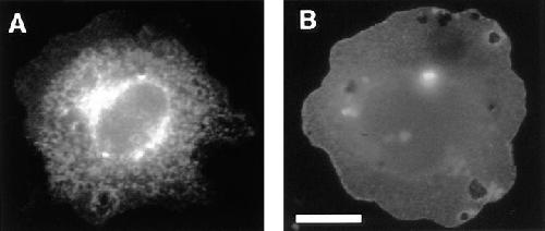 Figure 4. Surface localization of a chimeric molecule bearing the juxtamembrane region of the cadherin cytoplasmic tail alone. IL2R-669 and the parental IL2R molecule were transiently expressed in CHO cells and cells attached to poly-l-lysine–coated coverslips. Surface staining of the IL2R ectodomain in fixed, unpermeabilized cells was studied by immunofluorescence microscopy. IL2R-669, bearing the juxtamembrane region of the cadherin cytoplasmic tail stained in prominent clusters (A), whereas staining of the parent IL2R molecule was diffuse (B). Bar, 10 μm.