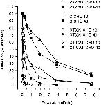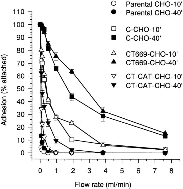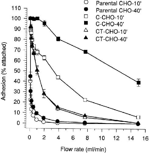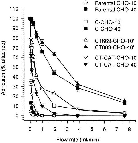 Figure 6. Adhesive activity of C-cadherin and mutants assessed by laminar flow assay. Parental CHO cells, C-CHO cells (clone 12), CT669-CHO cells (clone A1), and CT-CAT-CHO cells (clone 13), which were all matched for similar expression levels, were allowed to attach to glass capillaries for 10 or 40 min before adhesive strength was assessed by resistance to detachment by progressively increasing buffer flow rates. Data are means ± SE (n = 3).