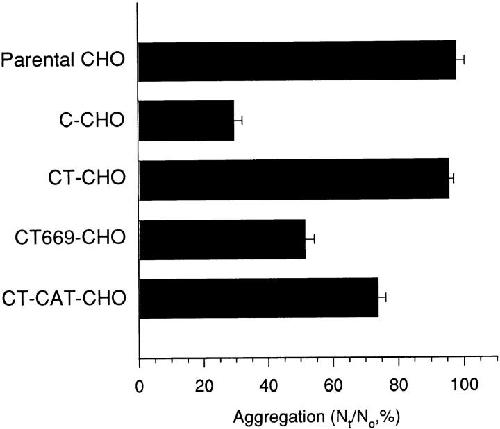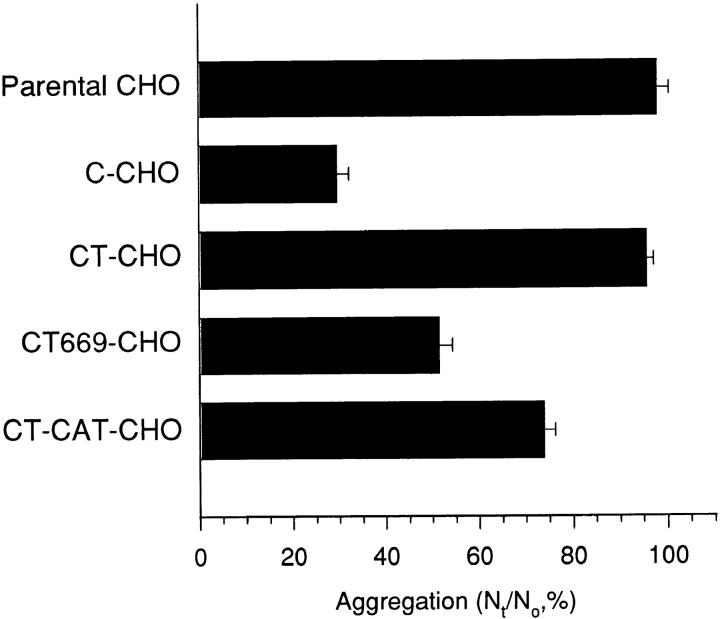 Figure 7. Adhesive activity of C-cadherin and mutant cadherin molecules assessed by aggregation in suspension. Parental CHO cells, C-CHO cells (clone 12), CT-CHO cells (clone 11), CT669-CHO cells (clone A1) and CT-CAT-CHO cells (clone 13), which were all matched for similar expression levels, were isolated by trypsinization in the presence of Ca2+, then allowed to aggregate in suspension. After 45 min the number of individual cells remaining in suspension (Nt) was counted and expressed as a percentage of the number of cells counted in the freshly isolated suspension (N0). Increased aggregation is reflected in a fall in the Nt/ N0 ratio. Data are means ± SE (n = 3).