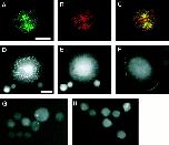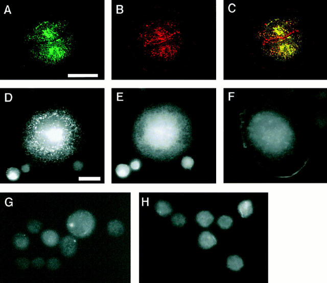 Figure 3. Clustering activity of wild-type and mutant C-cadherin molecules. CHO cells stably expressing C-cadherin or mutant molecules were allowed to attach for 1 h to glass substrata coated with CEC1-5 (AâE, G, and H) or poly-l-lysine (F) and then fixed and stained for the cadherin molecule (A, C, D, F, G, and H) or β-catenin (B, C, and E) by simultaneous dual-label immunofluorescence microscopy. Wild-type C-cadherin was detected using a polyclonal antibody raised against the whole cytoplasmic tail of mouse E-cadherin; mutants CT, CT669, and CT-CAT were detected by staining for the myc epitope tag. Specimens AâC were examined by confocal laser scanning microscopy with the plane of focus at the cellâ substrate interface; all other samples were examined by epi-illumination microscopy. (AâC) Wild-type C-cadherin localized in clusters (A) that colocalized with β-catenin (B), as seen by the yellow fluorescence in the overlay image (C). Some β-catenin that did not colocalize with C-cadherin was detected at borders where the cells were close but not directly touching; this is likely to be in a cytoplasmic pool. (D and E) CT669 clustered in cells attached to substrata coated with CEC1-5 (D), but not with poly-l-lysine (F). CT669 clusters did not colocalize with β-catenin that remained diffusely distributed within cells (E). The image in E was overexposed for clarity in reproduction and therefore may give a misleading impression of β-catenin expression in CT669-CHO cells, which was similar to untransfected CHO cells (Fig. 2). Neither CT (G) nor CT-CAT (H) clustered upon attachment to CEC1-5âcoated substrata. Note that CT-CHO and CT-CAT-CHO cells spread less on CEC1-5 than either C-CHO or CT669-CHO cells. Bars: (AâC) 25 μm; (DâH) 10 μm.