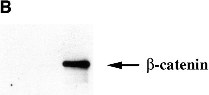 Figure 8. Identification of polypeptides that bind to GST-fusion proteins containing the cadherin cytoplasmic tail. (A) Binding of metabolically labeled proteins to GST fusion proteins. Lysates of 35S-labeled HCT116 cells were incubated with either GST, GST-Prox, or GST-FL. Bound proteins were separated by SDS-PAGE. A 92-kD protein binds to both GST-Prox and GST-FL but not to GST alone. (B) β-catenin bind to GST-FL but not to GST or GST-Prox. A Western blot of proteins bound to the GST fusion proteins was probed with a mAb to β-catenin.
