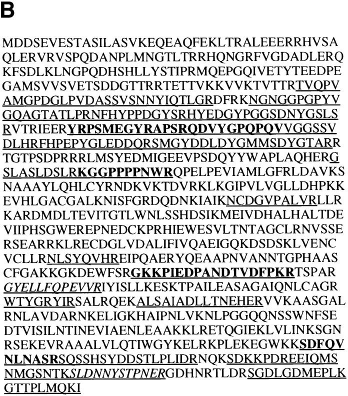 Figure 9. The 92-kD protein bound by GST-Prox is identical to p120ctn. (A) Detection of the 92-kD protein isolated from HCT116 in a large scale experiment. Coomassie brilliant blue staining of a large scale experiment isolating the 92-kD protein from HCT116 lysates using GST-Prox. Arrow marks the 92-kD protein. (B) Peptides identified in the protein sequence of p120ctn. Mass spectrometry analysis identified 27 major fragments that are underlined in the sequence. In bold are the sequences that were found in more than one peptide fragment. The two fragments that were subjected to NH2-terminal sequence analysis are shown in italics.