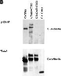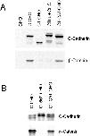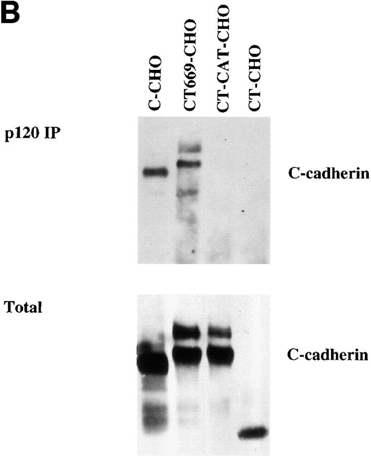 Figure 10. p120ctn associates with the proximal domain of C-cadherin in CHO cells. (A) p120ctn isoforms bind to both GST-Prox and GST-FL. Lysates of CHO cells were incubated with GST, GST-Prox, or GST-FL, transferred to nitrocellulose and probed with a mAb recognizing the major isoforms of p120ctn. (B) Wild-type Cadherin and CT669 but not CT-CAT or CT coimmunoprecipate with p120ctn. Lysates from C-CHO, CT669-CHO, C-CAT-CHO, and CT-CHO cells were immunoprecipitated with a mAb to p120ctn, transferred to nitrocellulose and probed for C-cadherin. In the bottom panel total lysates of these cells were also transferred to nitrocellulose and probed for C-cadherin to compare relative expression levels. C-cadherin immunoblots identify mature and precursor forms of the wild-type and mutant cadherins. Both the CT669 and CT-CAT mutants display polypeptide bands that run at or slightly higher than wild-type C-cadherin, consistent with the addition of muti-copy myc-epitope tags.