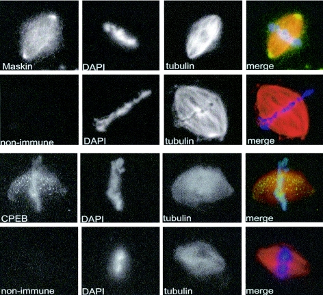 Fig. 6. Maskin and CPEB are associated with mitotic spindles and centrosomes. Xenopus egg extracts were supplemented with rhodamine-labeled tubulin and demembranated frog sperm DNA. Following incubation, the spindles were fixed and centrifuged onto glass coverslips, where they were immunostained for Maskin or CPEB and were costained with DAPI to detect DNA.