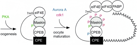 Fig. 8. Phosphorylation of Maskin. During oogenesis, when oocytes are arrested at the diplotene stage of prophase I, PKA phosphorylates (P) Maskin residue S626. When the oocytes are stimulated by progesterone to reenter the meiotic divisions (oocyte maturation), Aurora A is activated (23, 32) and phosphorylates CPEB S174; this event stimulates polyadenylation (1). The newly elongated poly(A) tail is bound by poly(A) binding protein (PABP), which in turn binds eIF4G and helps it displace Maskin from eIF4E, thereby initiating translation (2). cdk1, whose activity is detected after that of Aurora A (23), phosphorylates Maskin residues T58, S152, S311, S343, S453, and S638. These phosphorylations help Maskin dissociate from eIF4E. The S626 phosphorylation regulates the association of Maskin with the mitotic apparatus during embryogenesis and in adult somatic cells (13). Green, red, and blue Pâs indicate phosphorylation catalyzed by PKA, cdk1, and Aurora A, respectively.