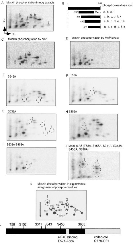 Fig. 3. Identification of maturation-specific Maskin phosphoamino acids. A. E. coli-expressed Maskin was phosphorylated in egg extracts, and the resulting phosphopeptides were identified arbitrarily. B. Several Maskin deletion proteins were added to egg extracts and processed for two-dimensional phosphopeptide mapping. The phoshopeptides that were lost when each deletion mutant was analyzed are noted. C. Maskin was phosphorylated in vitro with cdk1/cyclin B1 (MPF) and processed for two-dimensional phosphopeptide mapping. D. Maskin was phosphorylated in vitro with MAP kinase and processed for phosphopeptide mapping. E to I. Phosphorylation of Maskin containing an S343A, T58A, S638A, S152A, or S638A and S453A mutations in egg extracts. J. Phosphorylation of Maskin containing T58A, S152A, S311A, S343A, S453A, and S638A mutations (A6) in egg extracts. K. Representation of a Maskin phosphopeptide map showing the positions of peptides containing phosphorylated amino acids. Phosphopeptides 1 and 2 were not identified in these assays; phosphopeptide 2 was also detected in oocytes without progesterone stimulation (see Fig. âFig.4).4). L. Positions of phosphorylated residues of Maskin relative to the eIF4E binding domain and the coiled-coil domain. TLC, thin-layer chromatography; TLE, thin-layer electrophoresis.