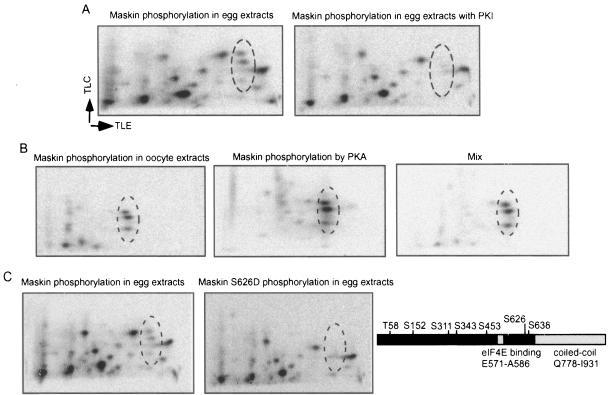 Fig. 4. Maskin is phosphorylated by PKA in oocyte extracts. A. E. coli-expressed Maskin was phosphorylated in egg extracts in the presence or absence of PKI, a specific inhibitor of PKA, and then processed for two-dimensional phosphopeptide mapping. The circled areas show phosphopeptides that were eliminated by PKI. B. Maskin was phosphorylated in oocyte extracts or by pure PKA and processed as described previously. The phosphopeptides from these two reactions were also mixed and analyzed on a two-dimensional phosphopeptide map. C. Wild-type or S626D Maskin proteins were phosphorylated in egg extracts and analyzed as described above. The circled area shows phosphopeptides that were eliminated when the mutant Maskin was used. The right portion shows all the Maskin phosphoamino acids in relation to the eIF4E binding and coiled-coil domains. TLC, thin-layer chromatography; TLE, thin-layer electrophoresis