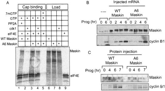 Fig. 5. Phosphorylation controls Maskin association with eIF4E and translation of CPE-containing mRNA. A. mRNAs encoding wild-type (WT) Maskin, A6 Maskin (T58A, S152A, S311A, S343A, S453A, S638A), and eIF4E were translated in reticulocyte lysates in the presence of [35S]methionine. The lysates also contained 0.2 mM GTP and in some cases 0.25 mM 7mGTP (i.e., free cap), cdk1/cyclin B1, or the phosphatase PP2A. One-twentieth of each lysate was analyzed for Maskin and eIF4E synthesis (load), while the rest was applied to cap columns. The material that was retained on the columns was analyzed by SDS-PAGE and autoradiography. B. mRNAs encoding WT or A6 Maskin proteins were injected into oocytes, which were then stimulated with progesterone (Prog) for various times. Protein from the oocytes was extracted, Western blotted, and probed for Maskin and cyclin B1. C. E. coli-expressed WT and A6 Maskin proteins were injected into oocytes, some of which were treated with progesterone. At the indicated times, the oocytes were harvested; the protein was extracted and probed on Western blots for Maskin and cyclin B1.