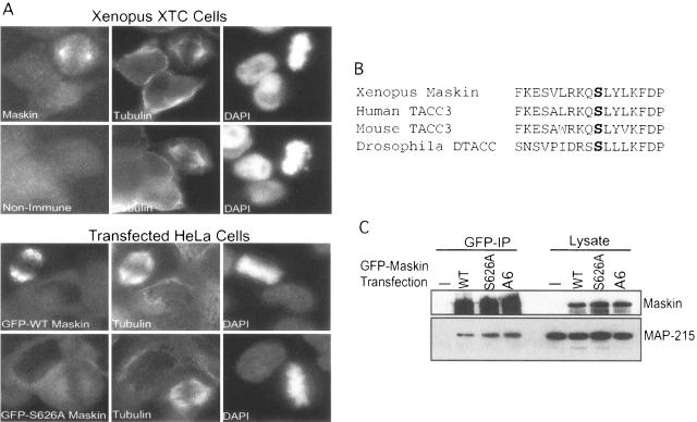 Fig. 7. Serine 626 directs Maskin to the mitotic apparatus. A. Xenopus tissue culture cells (XTC) were immunostained for Maskin and tubulin and costained with DAPI. HeLa cells were also transfected with plasmids encoding GFP fused to wild-type or S626A mutant Maskin molecules. The cells were immunostained for tubulin and costained with DAPI. B. Limited sequence alignment among Xenopus Maskin, human and mouse TACC3, and Drosophila DTACC denoting a conserved serine corresponding to Maskin serine 626. C. HeLa cells were transfected with the same constructs, as well as GFP-Maskin A6, as noted for panel A (bottom). Antibody directed against GFP was use to coimmunoprecipitate MAP-215, a protein that links TACC family proteins to microtubules; this protein and the Maskin fusion proteins were detected by Western blotting.