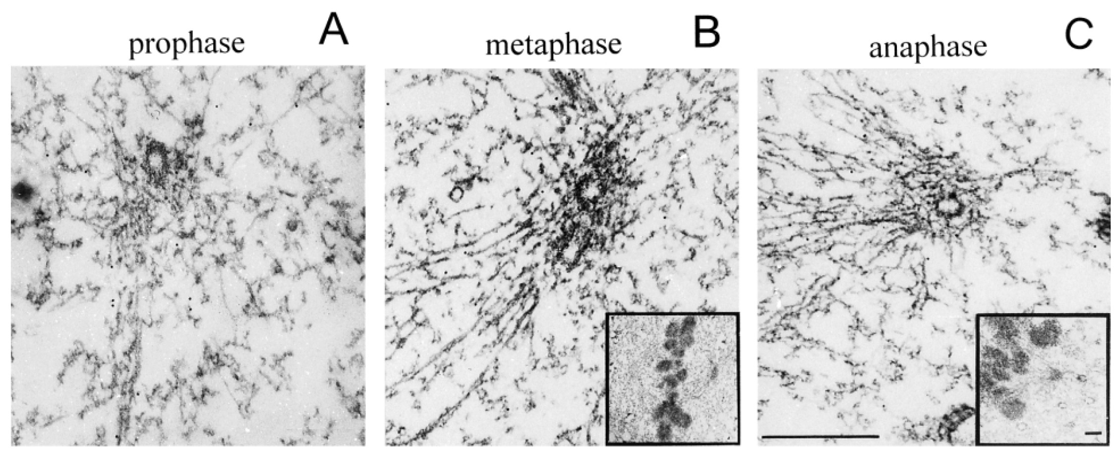 and (C) one pole of a spindle in anaphase (the position of chromosomes is shown in the lower panel). Bars: 1 mm (A, B and C); 0.5 mm (insets
