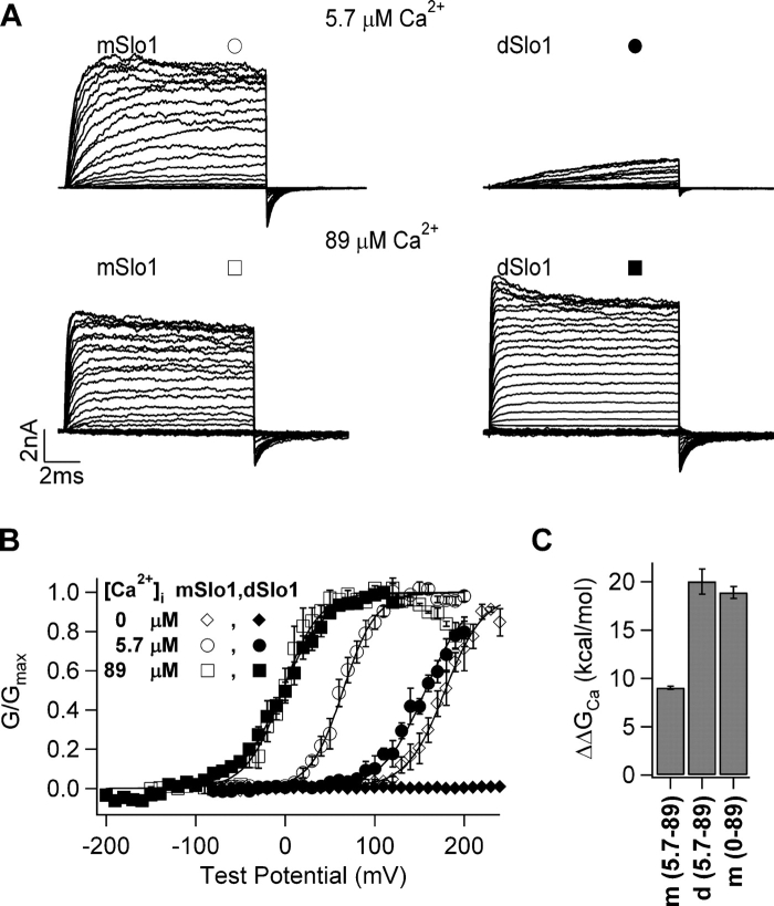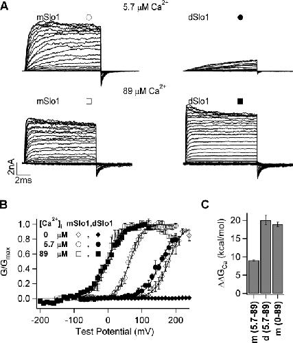 Figure 1. dSlo1 activation exhibits higher Ca2+ sensitivity than mSlo1. (A) Current traces of mSlo1 and dSlo1. Test potentials were −80 to +200 mV and −150 to +200 mV for 5.7 μM and 89 μM [Ca2+]i, respectively, holding and repolarization potentials were −50 mV. (B) Steady-state G-V relations of mSlo1 and dSlo1. Smooth curves are fits of the Boltzmann equation (see MATERIALS AND METHODS) with parameters for mSlo1, in 0 [Ca2+]i: V1/2 = 179 mV, z = 1.2, in 5.7 μM [Ca2+]i, V1/2 = 64.6 mV, z = 1.4, in 89 μM [Ca2+]i, V1/2 = −2.8 mV, z = 1.2; for dSlo1, in 5.7 μM [Ca2+]i, V1/2 = 157 mV, z = 1.3, in 89 μM [Ca2+]i, V1/2 = −2.9 mV, z = 1.1. (C) Free energy provided by Ca2+ binding for channel activation when [Ca2+]i changes from 0 or 5.7 μM to 89 μM, as indicated in parentheses under the abscissa. m, mSlo1; d, dSlo1.