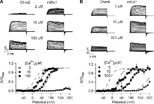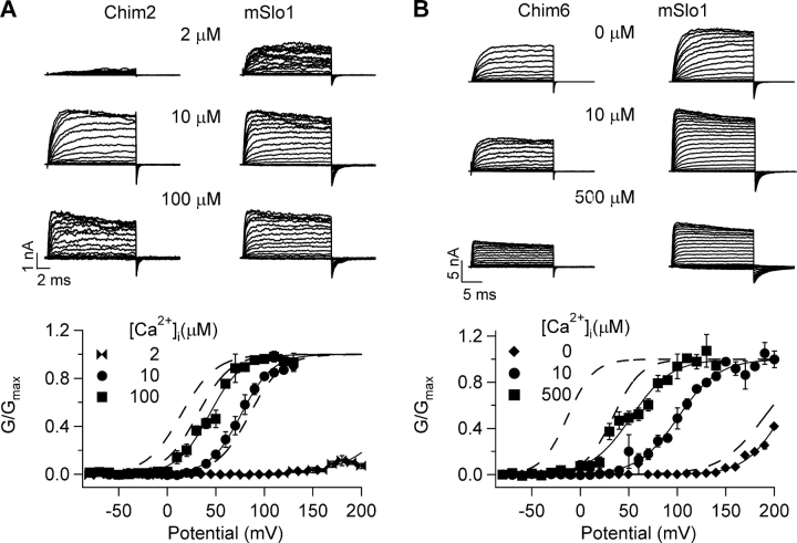 Figure 2. Chimeric channels of mSlo1 and dSlo1 retain features of their native WT channels. (A, top) Current traces of Chim2 and mSlo1 at [Ca2+]i of 2, 10, and 100 μM. Test potentials were −80 to +200 mV, holding and repolarization potentials were −50 mV. (Bottom) Steady-state G-V relations of Chim2 and mSlo1. Smooth curves are fits of the Boltzmann equation with parameters for Chim2, in 2 μM [Ca2+]i: V1/2 = 240.1 mV, z = 0.95, in 10 μM [Ca2+]i: V1/2 = 76.1 mV, z = 1.5, in 100 μM [Ca2+]i: V1/2 = 43.5 mV, z = 1.5; for mSlo1, in 2 μM [Ca2+]i: V1/2 = 84.8 mV, z = 1.5, in 10 μM [Ca2+]i: V1/2 = 31.4 mV, z = 1.5, in 100 μM [Ca2+]i: V1/2 = 14.4 mV, z = 1.4. (B, top) Current traces of Chim6 and mSlo1 at [Ca2+]i of 0, 10, and 500 μM. Test potentials were −80 to +200 mV, holding and repolarization potentials were −50 mV. (Bottom) Steady-state G-V relations of Chim6 and mSlo1. Smooth curves are fits of the Boltzmann equation with parameters for Chim6, in 0 [Ca2+]i: V1/2 = 206.7 mV, z = 1.3, in 10 μM [Ca2+]i: V1/2 = 101.1 mV, z = 1.2, in 500 μM [Ca2+]i: V1/2 = 52.5 mV, z = 1.2; for mSlo1, in 0 [Ca2+]i: V1/2 = 189.7 mV, z = 1.1, in 10 μM [Ca2+]i: V1/2 = 33.8 mV, z = 1.7, in 500 μM [Ca2+]i: V1/2 = −13.2 mV, z = 1.8.