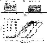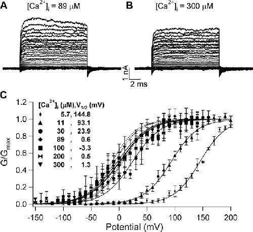 Figure 3. Activation of dSlo1 saturates around 89 μM [Ca2+]i. (A and B) Current traces of dSlo1 for indicated [Ca2+]i elicited by voltages from −150 to 200 mV. (C) Steady-state G-V curves of dSlo1. Solid curves are fits of the Boltzmann equation. V1/2 obtained from the fits of the G-V relations at each [Ca2+]i is indicated. Dotted lines indicate MWC model simulations of the G-V relation at [Ca2+]i 89, 100, 200, and 300 μM using the same parameters as indicated in Fig. 10 C.