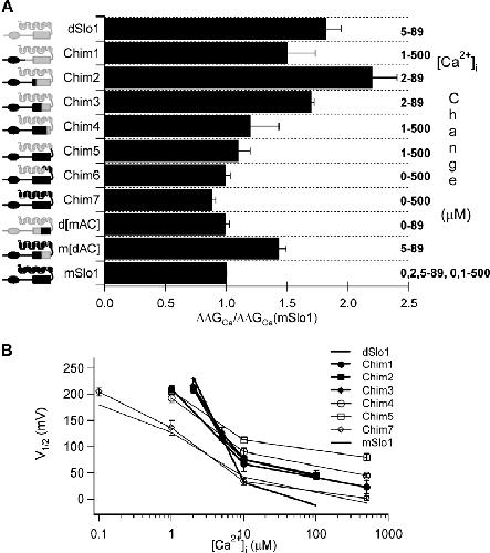 Figure 4. The AC region in the RCK1 domain is important for Ca2+ sensitivity. (A) Ca2+ sensitivity of activation in chimeric channels of mSlo1 and dSlo1. The vertical axis shows schematic representation of chimera constructs with dSlo1 portions shaded gray and mSlo1 black. Rectangles are transmembrane segments or RCK1 domains (Jiang et al., 2002a), ovals are the Ca2+ bowl (Schreiber et al., 1999). Free energy increase in response to increase in [Ca2+]i (shown at the right) for each chimera and WT channel was normalized against that for mSlo1. (B) Plot of V1/2 versus [Ca2+]i for mSlo1 (thin black line), dSlo1 (thick black line), and the chimeric channels as defined in A. V1/2 values are obtained by fitting the G-V relations of the channels at various [Ca2+]i with the Boltzmann equation.