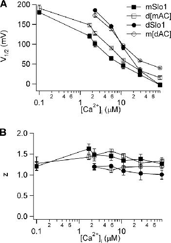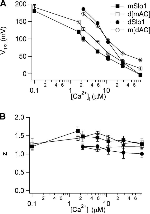 Figure 5. The AC region switches Ca2+ sensitivity between mSlo1 and dSlo1. Plot of (A) V1/2 and (B) z versus [Ca2+]i for mSlo1, dSlo1, m[dAC], and d[mAC]. V1/2 and z are obtained by fitting the G-V relations of the channels at various [Ca2+]i with the Boltzmann equation.