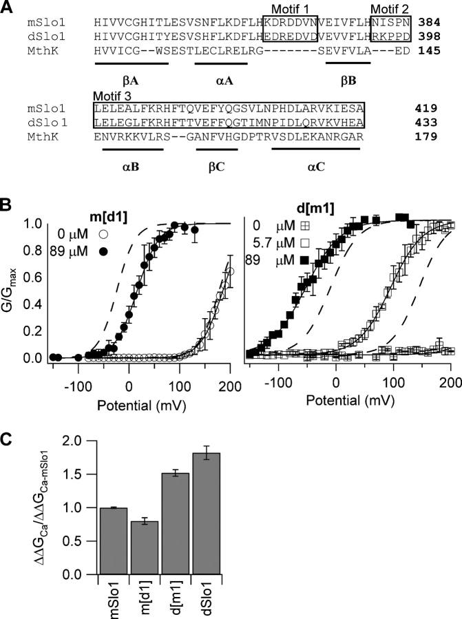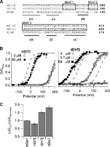 Figure 6. Ca2+ sensitivity change is not related to the Ca2+ binding site in the AC region. (A) Sequence alignment of the AC region of the RCK1 domain (Jiang et al., 2002a) from mSlo1 (Butler et al., 1993), dSlo1 (Adelman et al., 1992), and the archeon MthK (Jiang et al., 2002a). Numbers indicate the position of the rightmost residues in the primary sequence of respective proteins. Secondary structures βA-C and αA-C are indicated by underlines. Boxed amino acids labeled as motifs 1, 2, and 3 are regions showing significant sequence differences between mSlo1 and dSlo1. Motif 1 is important for Ca2+-dependent activation (Shi et al., 2002; Xia et al., 2002). Effects of switching motif 1 between mSlo1 and dSlo1 are shown in B and C. (B, left) Steady-state G-V relations of the mutant channel m[d1] (motif 1 from dSlo1 in the mSlo1 background). Solid lines are fits of the Boltzmann equation with the following parameters: at 0 [Ca2+]i, V1/2 = 185 mV, z = 1.2; at 89 μM [Ca2+]i, V1/2 = 15.9 mV, and z = 1.2. Dotted lines are G-V relations of mSlo1. (B, right) Steady-state G-V relations of the mutant channel d[m1] (motif 1 from mSlo1 in the dSlo1 background). Solid lines are fits of the Boltzmann equation with the following parameters: at 89 μM [Ca2+]i, V1/2 = −52.5 mV, z = 0.83; at 5.7 μM [Ca2+]i, V1/2 = 95.1 mV and z = 0.89; at 0 [Ca2+]i, the G-V relation was too right shifted for z and V1/2 values to be determined. Dotted lines are G-V relations of dSlo1. (C) Free energy of activation provided by Ca2+ binding in mSlo1, d[m1], m[d1], and dSlo1 when [Ca2+]i increased from 0 to 89 μM (for m[d1]) and from 5.7 to 89 μM (for d[m1] and dSlo1), normalized against corresponding free energy values for mSlo1.
