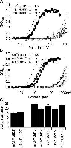 Figure 7. Switching sequence differences in AC region between mSlo1 and dSlo1 either singly or in combination does not switch Ca2+ sensitivity of BKCa gating. (A) Steady-state G-V relations of m[d-Motif2] and m[d-Motif3]. Dotted lines are G-V relations of mSlo1. Parameters of the Boltzmann fits (solid lines): for m[d-Motif2], at 0 [Ca2+]i, V1/2 = 195.7 mV, z = 1.1; at 100 μM [Ca2+]i, V1/2 = 8.2 mV, z = 1.2; for m[d-Motif3], at 0 [Ca2+]i, V1/2 = 213.2 mV, z = 1.1; at 100 μM [Ca2+]i, V1/2 = 9.2 mV, z = 1.2. (B) Steady-state G-V relations of m[d-Motif12] and m[d-Motif13]. Dotted lines are G-V relations of mSlo1. Parameters of the Boltzmann fits (solid lines): for m[d-Motif12], at 0 [Ca2+]i, V1/2 = 186.5 mV, z = 1.2; at 100 μM [Ca2+]i, V1/2 = 22.2 mV, z = 1.1; for m[d-Motif13], at 0 [Ca2+]i, V1/2 = 211.9 mV, z = 1.4; at 100 μM [Ca2+]i, V1/2 = 38.4 mV, z = 1.3. (C) Free energy of activation provided by Ca2+ binding for the chimeric channels. Free energy change for each channel was in response to [Ca2+]i change shown in parentheses for mSlo1 plotted alongside each group.