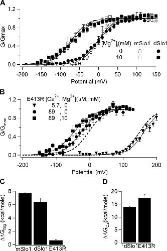 Figure 8. High Ca2+ sensitivity in dSlo1 is not related to the low affinity metal binding site. (A) Steady-state G-V relations of mSlo1 and dSlo1 at 89 μM [Ca2+]i and indicated [Mg2+]i. Boltzmann fits (smooth curves) gave following parameters: mSlo1, for 0 [Mg2+]i, V1/2 = −2.8 mV, z = 1.2, for 10 mM [Mg2+]i, V1/2 = −73.8 mV, z = 1.1; dSlo1, for 0 [Mg2+]i, V1/2 = −2.9 mV, z = 1.1, for 10 mM [Mg2+]i, V1/2 = −69.2 mV, z = 0.94. (B) Steady-state G-V relations of the E413R mutant dSlo1 channel. Boltzmann fits (solid curves) gave the following: E413R, for 5.7 μM [Ca2+]i, V1/2 = 163 mV, z = 1.1, for 89 μM [Ca2+]i, 0 [Mg2+]i, V1/2 = −24.6 mV, z = 0.95, for 89 μM [Ca2+]i, 10 mM [Mg2+]i, V1/2 = −46.7 mV, z = 0.87. Dotted lines are G-V relations for dSlo1 at 5.7 μM [Ca2+]i and 89 μM [Ca2+]i, 0 [Mg2+]i. (C) Free energy provided by Mg2+ binding for channel activation in mSlo1, dSlo1, and E413R dSlo1 when [Mg2+]i changes from 0 to 10 mM, measured at [Ca2+]i of 89 μM. (D) Free energy provided by Ca2+ binding for channel activation in WT and E413R dSlo1 when [Ca2+]i changes from 5.7 to 89 μM.