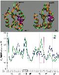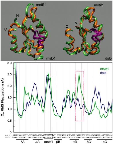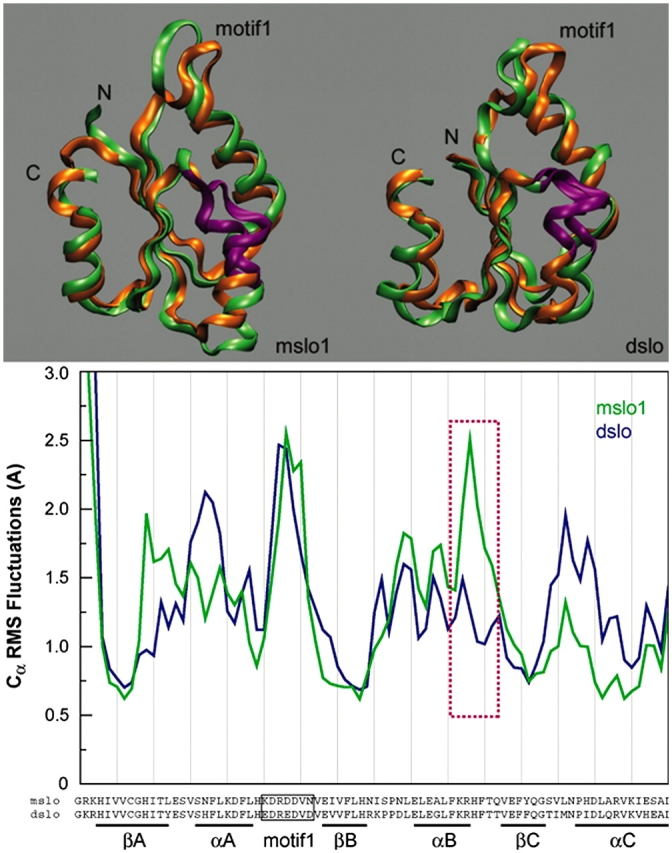 Figure 9. Molecular dynamics simulations of the AC region of mSlo1 and dSlo1. Top panels show the extrema (green and orange) of the motion along the principal eigenvector for the AC region from mSlo1 (left) and dSlo1 (right) (see MATERIALS AND METHODS). Part of helix B highlighted in purple shows the region of largest dynamic difference between the structures of mSlo1 and dSlo1. Bottom panel shows the RMS fluctuations for the Cα's of the above structure. The purple box denotes the same region (αB) highlighted above. Amino acid in the sequence at the bottom corresponds to the Cα whose dynamics are plotted above. Molecular graphics were produced using visual molecular dynamics (VMD) (Humphrey et al., 1996).