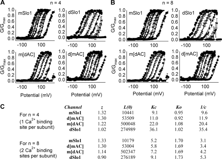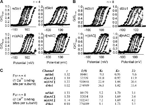Figure 11. The AC region affects Ca2+ binding to closed channels. (A and B) G-V relations of mSlo1, dSlo1, d[mAC], and m[dAC] channels at [Ca2+]i of 0, 1.7, 2.3, 5.7, 11.2, 28.5, and 89 μM. Each dataset was fit (smooth curves) by the MWC model (Eq. 4), n = 4 (A) or 8 (B). (C) Parameters of fits obtained from A and B.