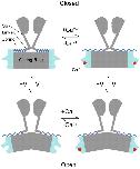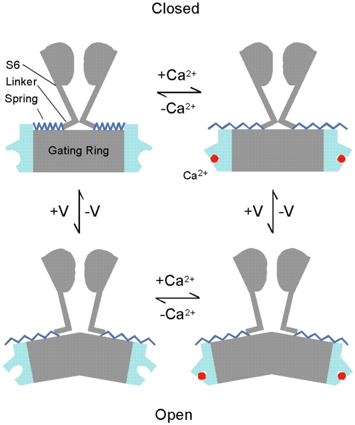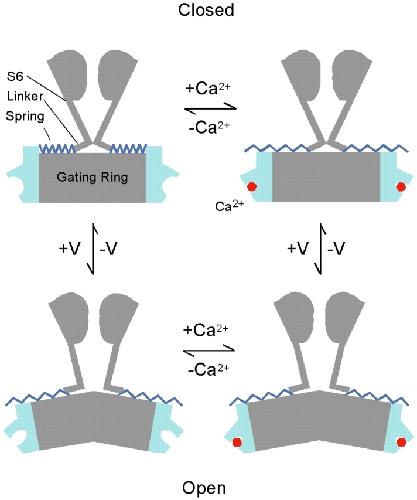 Figure 12. Spring effect of the AC region in channel gating. In the absence of bound Ca2+ and in the closed conformation, the AC region adopts a conformation that inhibits channel opening. Ca2+ binding (+Ca2+) or channel opening by depolarization (+V) removes this inhibition, rendering the channel gate more favorable to the open conformation. In the open conformation or when the Ca2+ binding sites are occupied, the AC region has little effect on channel gating.