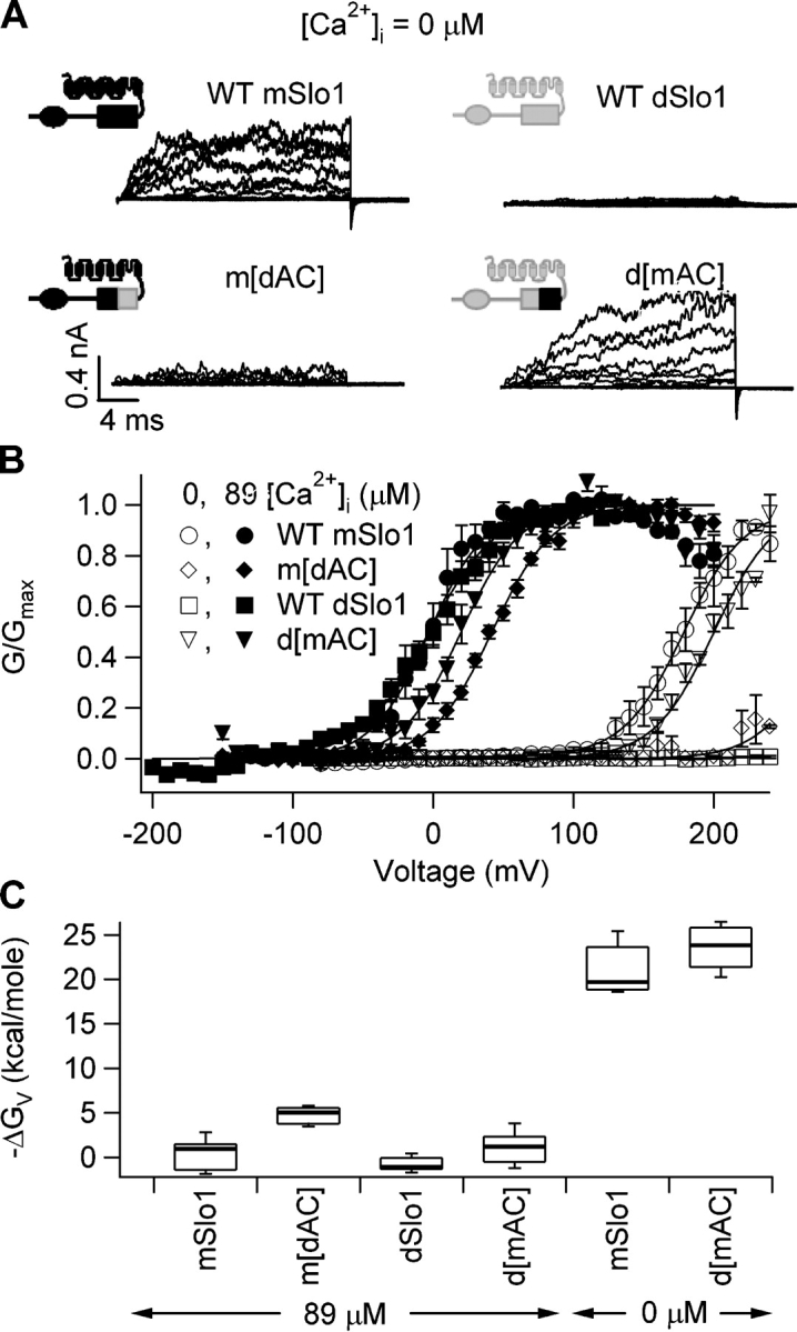 Figure 10. Modulation of BKCa activation by the AC region depends on Ca2+ occupancy. (A) Current traces of mSlo1, dSlo1, d[mAC], and m[dAC] at 0 [Ca2+]i. Test voltages were from −80 to 200 mV with a holding and repolarization potential of −50 mV. (B) Steady-state G-V relations of above channels at 0 (open symbols) and 89 μM (filled symbols) [Ca2+]i. Smooth curves are fits to the Boltzmann equation. At 89 μM [Ca2+]i, for mSlo1: V1/2 = −2.8 mV, z = 1.2; for d[mAC]: V1/2 = 7.7 mV, z = 1.4; for dSlo1: V1/2 = −2.9 mV, z = 1.1; for m[dAC]: V1/2 = 41.6 mV, z = 1.2. At 0 [Ca2+]i, for mSlo1: V1/2 = 179 mV, z = 1.2; for d[mAC]: V1/2 = 181 mV, z = 1.3. The voltage range of dSlo1 and m[dAC] activation at 0 [Ca2+]i is too positive to record any current. (C) Box plot of ΔGV = zV1/2 for the above channels at 0 and 89 μM [Ca2+]i. The percentile values shown are 10, 25, 50, 75, and 90 for each channel. ΔGV for m[dAC] and dSlo1 at 0 [Ca2+]i are too large to be determined.