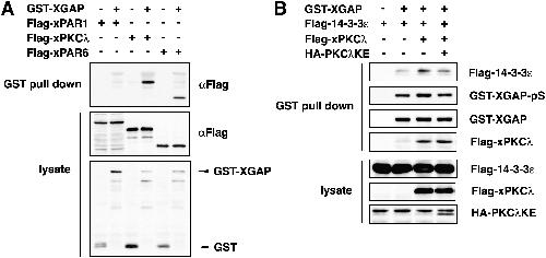 (A) XGAP binds to xPAR-6 or xPKCλ. GST-tagged XGAP was expressed with Flag-xPAR-1, Flag-xPKCλ, Flag-xPAR-6, or Myc-rPAR-3 in HeLa cells.