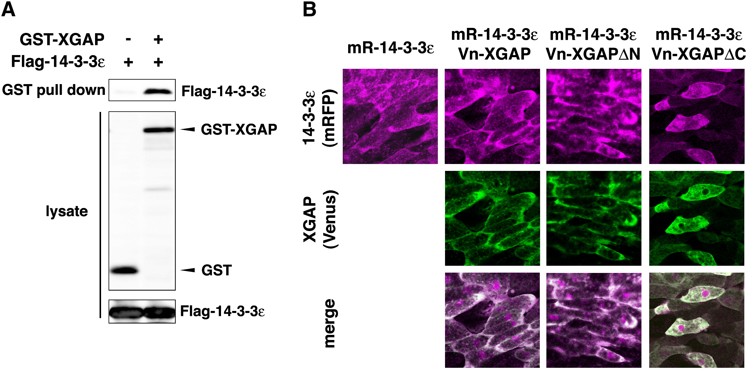 (B) XGAP directs the localization of 14-3-3É through XGAP's C-terminal region. The mRNA of mRFP-tagged 14-3-3É with or without the mRNA of each truncated construct of Venus-tagged XGAP was coexpressed in the DMZ.