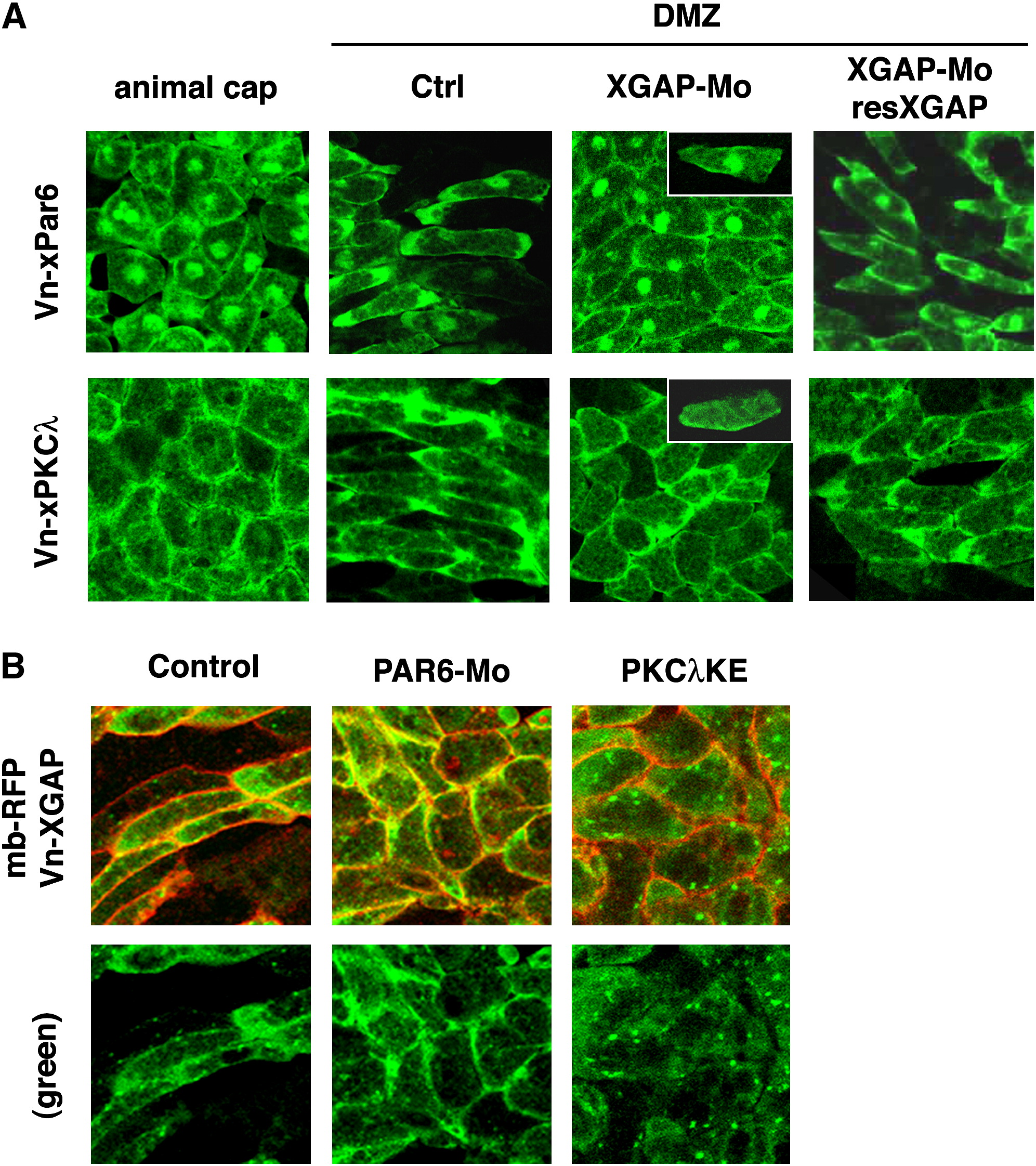 (B) xPAR-6 and xPKCλ are required for the polarized localization of XGAP. Venus-tagged XGAP was coinjected with xPAR-6 Mo or xPKCλKE and fated to DMZ. The membrane bound RFP was also injected to mark the cell membrane. The horizontal plane is the mediolateral axis.