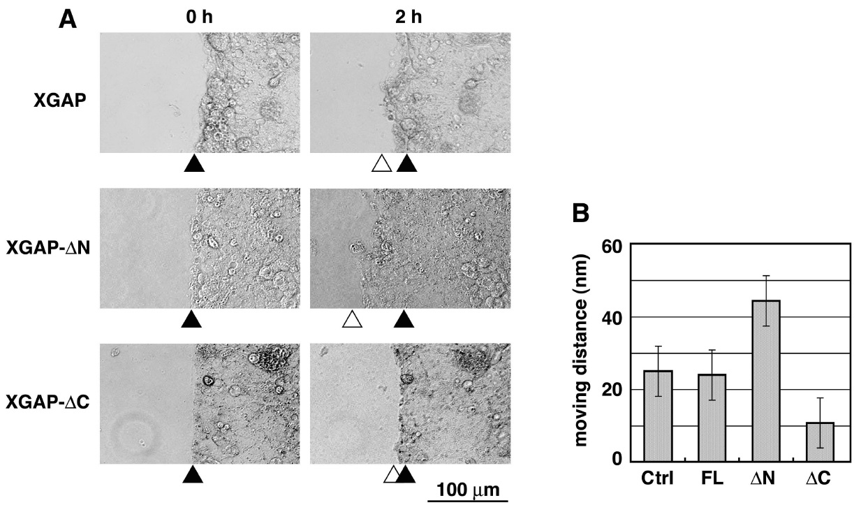 (A, B) XGAP-DN increased the distance cells moved toward a scratched field. To compare the