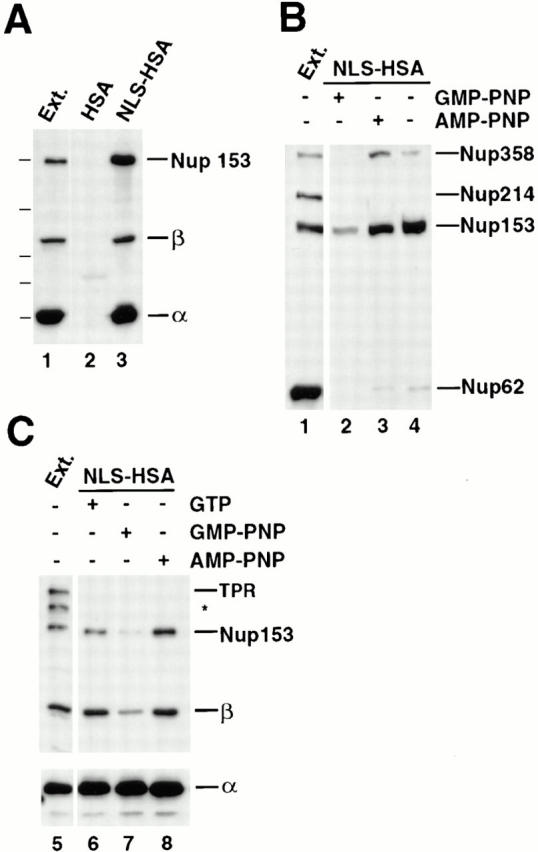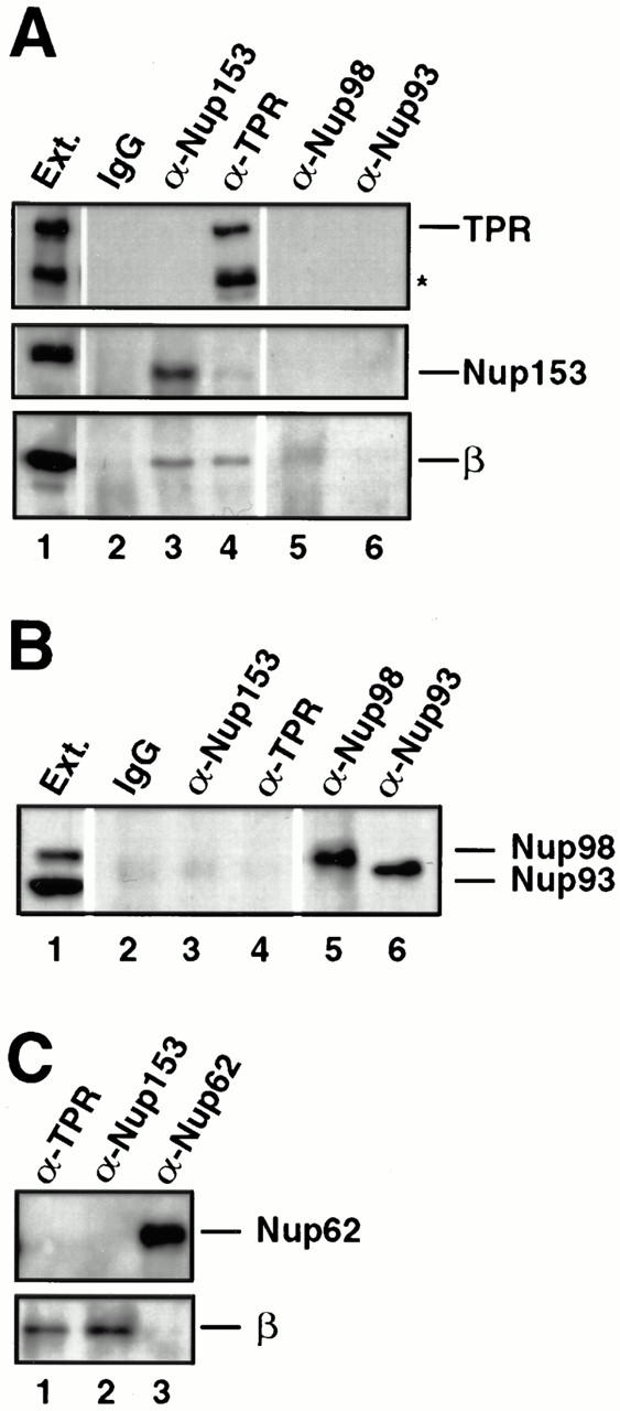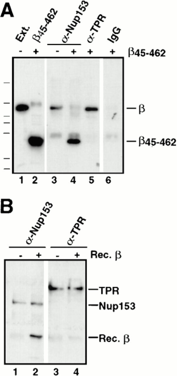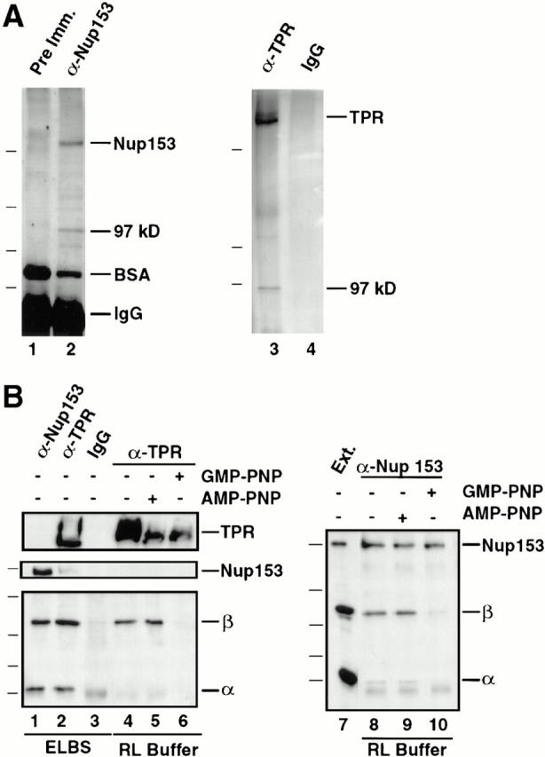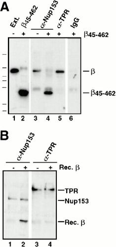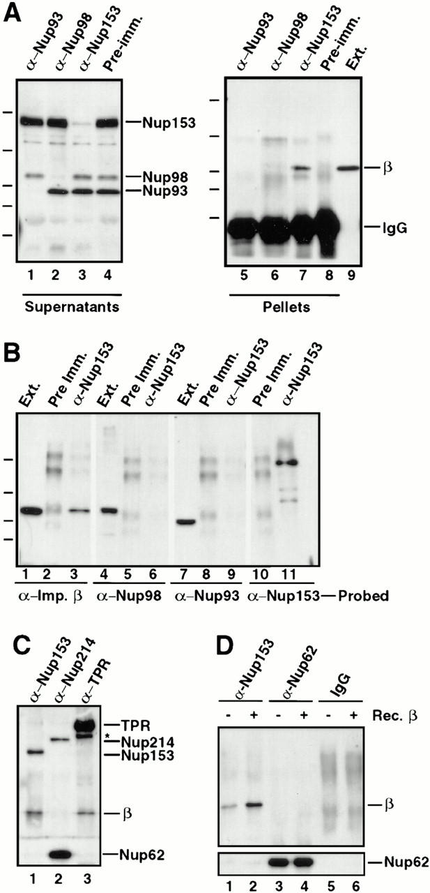 A major question in nuclear import concerns the identity of the nucleoporin(s) that interact with the nuclear localization sequences (NLS) receptor and its cargo as they traverse the nuclear pore. Ligand blotting and solution binding studies of isolated proteins have attempted to gain clues to the identities of these nucleoporins, but the studies have from necessity probed binding events far from an in vivo context. Here we have asked what binding events occur in the more physiological context of a Xenopus egg extract, which contains nuclear pore subcomplexes in an assembly competent state. We have then assessed our conclusions in the context of assembled nuclear pores themselves. We have used immunoprecipitation to identify physiologically relevant complexes of nucleoporins and importin subunits. In parallel, we have demonstrated that it is possible to obtain immunofluorescence localization of nucleoporins to subregions of the nuclear pore and its associated structures. By immunoprecipitation, we find the nucleoporin Nup153 and the pore-associated filament protein Tpr, previously shown to reside at distinct sites on the intranuclear side of assembled pores, are each in stable subcomplexes with importin alpha and beta in Xenopus egg extracts. Importin subunits are not in stable complexes with nucleoporins Nup62, Nup93, Nup98, or Nup214/CAN, either in egg extracts or in extracts of assembled nuclear pores. In characterizing the Nup153 complex, we find that Nup153 can bind to a complete import complex containing importin alpha, beta, and an NLS substrate, consistent with an involvement of this nucleoporin in a terminal step of nuclear import. Importin beta binds directly to Nup153 and in vitro can do so at multiple sites in the Nup153 FXFG repeat region. Tpr, which has no FXFG repeats, binds to importin beta and to importin alpha/beta heterodimers, but only to those that do not carry an NLS substrate. That the complex of Tpr with importin beta is fundamentally different from that of Nup153 is additionally demonstrated by the finding that recombinant beta or beta45-462 fragment freely exchanges with the endogenous importin beta/Nup153 complex, but cannot displace endogenous importin beta from a Tpr complex. However, the GTP analogue GMP-PNP is able to disassemble both Nup153- and Tpr-importin beta complexes. Importantly, analysis of extracts of isolated nuclei indicates that Nup153- and Tpr-importin beta complexes exist in assembled nuclear pores. Thus, Nup153 and Tpr are major physiological binding sites for importin beta. Models for the roles of these interactions are discussed.