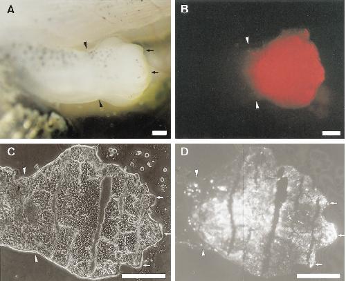 FIG. 2. PKH-26-labeled recombinant limb made from stage 51 mesenchyme. (A and B) Whole-mount preparation of a recombinant limb. (C and D) Cryosection of the same recombinant limb. (A and C) In ordinary light. (B and D) In fluorescent light. 18 days after operation. Small arrows indicate protrusions which later form digits. Note that the protrusion-forming regions are of graft origin. Bars, 250 mm.
