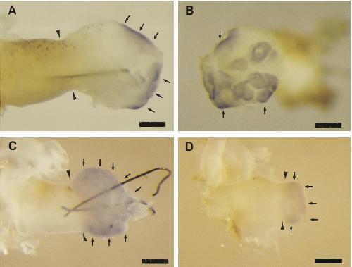 FIG. 3. Whole-mount in situ hybridization of fgf-8 (A) and shh (C) in recombinant limbs. (A) Dorsal view of the recombinant made from stage 56 mesenchyme showing that fgf-8 expression is restricted in the distal region of the recombinant. (B) Frontal view of the same recombinant as in (A), showing that there are multiple separate expression domains in the recombinant. (C) Dorsal view of the recombinant made from stage 52 mesenchyme showing widespread distribution of shh. (D) Dorsal view of the recombinant made from stage 56 mesenchyme showing shh expression in whole recombinants. Arrowheads show the hostraft boundary. Bars, 250 um.