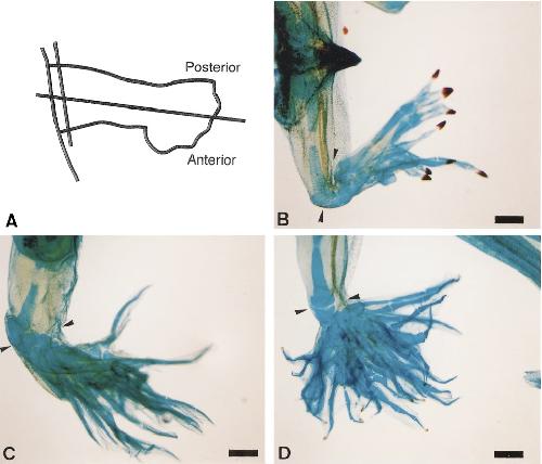 FIG. 5. Multiple digit formation in the recombinants with anterior, posterior, and whole mesenchyme. (A) Schematic diagram showing stage 556 limb buds used for the preparation of mesenchyme. The solid line indicates the incision dividing the limb bud into the anterior and posterior halves. (B) Dorsal views of the recombinants made from the anterior (B), posterior (C), and both anterior and posterior (D) mesenchyme. Note that all digits have a claw in (B) but no digits have a claw in (C), and some digits have a claw in (D). Arrowheads show the hostraft boundary. Bars, 1 mm.